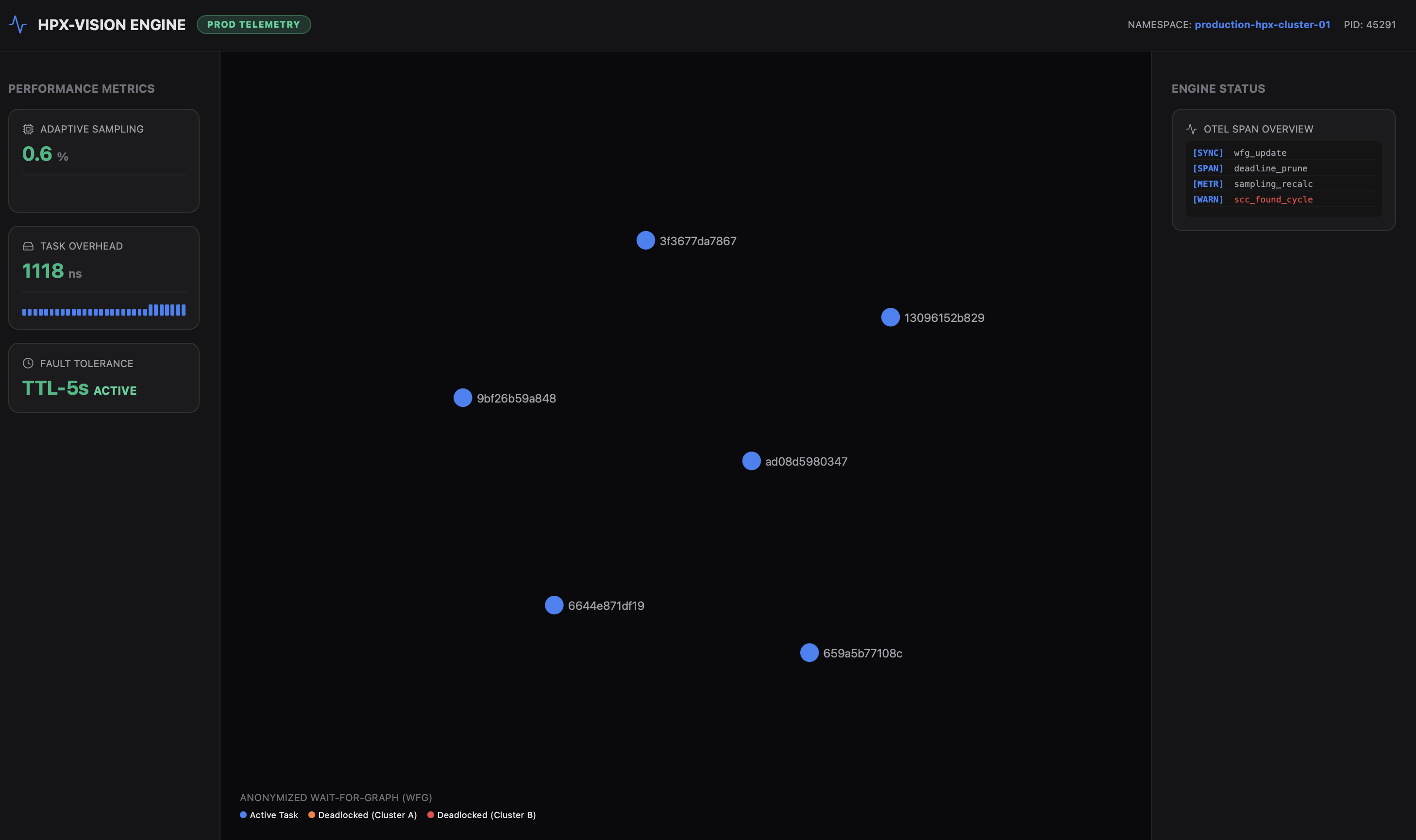 Tracks inter-task dependencies and detects deadlocks using Tarjan’s SCC algorithm.